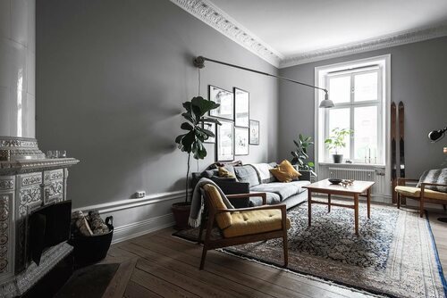 Светлые оттенки серого создадут ощущение простора и воздушности, идеально подойдут для небольших помещений. Темные оттенки придадут интерьеру загадочность и глубину, особенно если использовать контраст с белым плинтусом.