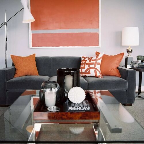 (Фото 1: серо оранжевая гостиная с оранжевыми стенами и серой мебелью)
