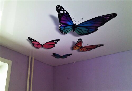 3. Декоративные элементы. Купите готовые декоративные бабочки и прикрепите их к потолку с помощью ниток или прозрачной рыболовной лески. Расположите бабочки вдоль потолка или создайте композицию из нескольких бабочек, чтобы добавить глубину и объем к вашему интерьеру.