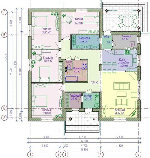 Классическая планировка одноэтажного дома предполагает размещение гостиной, кухни, спальных комнат и санузлов на одном уровне. Это удобно для семей с детьми или пожилыми людьми, которым необходимо избегать лестниц и перепадов уровней. Фотография ниже демонстрирует пример классической планировки.