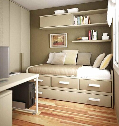Открытые полки также могут быть полезны в квадратных маленьких комнатах. Они не только добавят декоративный элемент, но и позволят эффективно использовать вертикальное пространство для хранения книг, декоративных предметов и других вещей.