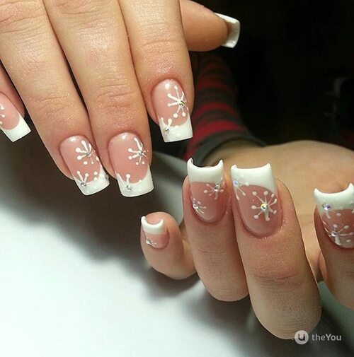 Еще один вариант новогоднего маникюра - белый френч с новогодними рисунками. Вы можете нарисовать на ногтях различные символы и элементы, связанные с Новым годом - снежинки, елочки, санта-клауса и многое другое. Используйте тонкую кисточку и акриловые краски, чтобы создать эти уникальные дизайны. Ваш маникюр будет выглядеть нарядно и стильно!