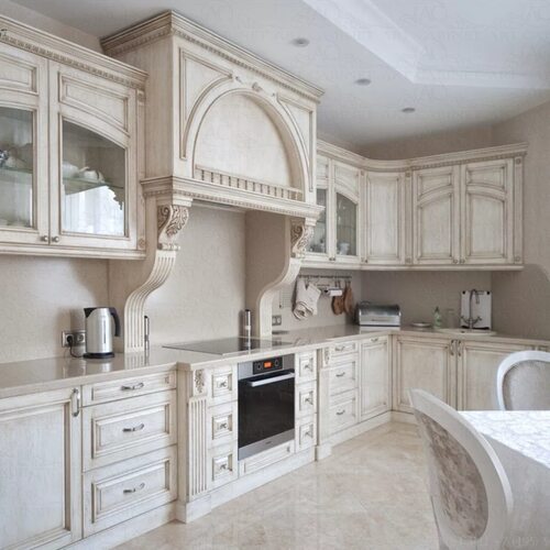 Одной из характеристик светлых кухонь в классическом стиле является использование натуральных материалов, таких как дерево и камень. Деревянные фасады с отделкой под старину или патину придают кухне особый шарм и создают ощущение теплоты и уюта. Пастельные оттенки, такие как бежевый, светло-серый или слоновая кость, добавляют нежности и элегантности в интерьер.