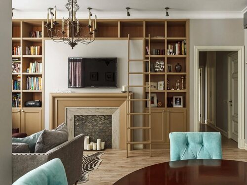 Классический стиль гостиной с книжным шкафом отличается изысканностью и элегантностью. В центре внимания стоит большой деревянный книжный шкаф с резными элементами. Он может быть украшен стеклянными дверцами или дополнен витринами для выставки коллекций книг или предметов искусства. Мягкая мебель в этом стиле подчеркнет роскошь и изысканность интерьера.