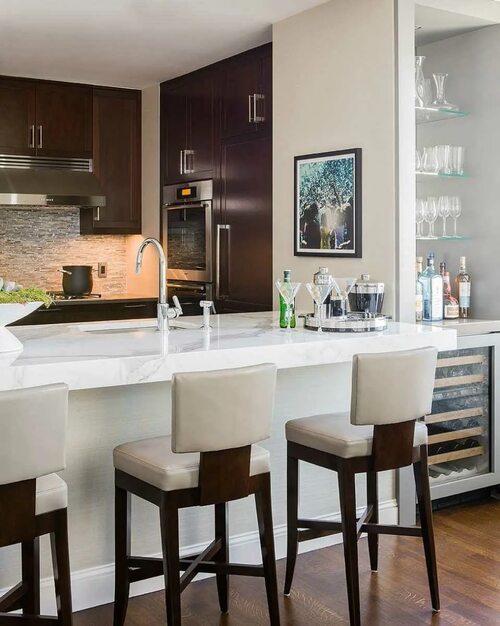 Классический стиль подразумевает использование дерева и изящных декоративных элементов. Кухни с барными стойками в классическом стиле создают атмосферу тепла и комфорта. Они часто имеют элегантные детали, такие как изогнутые ножки стульев и резные узоры на стойке. Это идеальный выбор для тех, кто предпочитает традиционный дизайн.