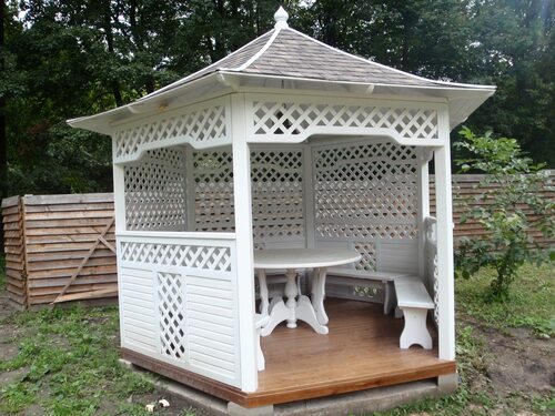 Ниже представлены фотографии различных дизайнерских решений белых беседок из дерева, которые могут послужить вдохновением для создания собственного уголка отдыха:
