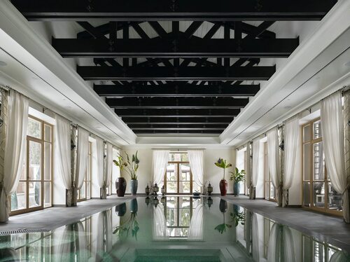 Дом Никиты Михалкова впечатляет своей грандиозностью и изысканностью. Архитектурный стиль здания отражает классические элементы, смешанные с современными акцентами. Фасад украшен изящными колоннами, а окна и двери обрамлены изысканными деталями.
