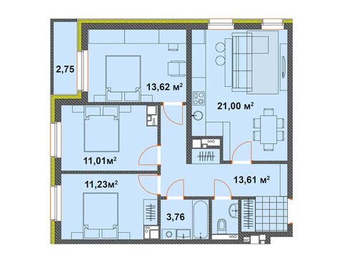 Если вам необходимо создать отдельные спальные комнаты, то двухкомнатная планировка будет идеальным решением. В таком варианте дома на фотографии вы можете увидеть, что спальные комнаты расположены по бокам от гостиной и кухни, что обеспечивает максимальную приватность каждого члена семьи.