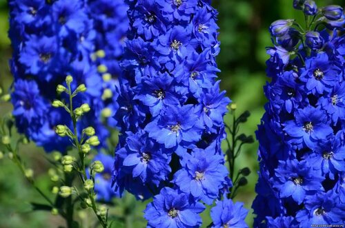 - Дельфиниум гибридный 'Blue Bird': цветки ярко-голубого цвета с белой серединой;