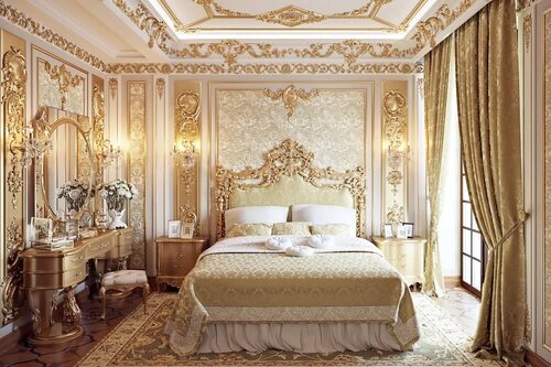 3. Освещение: В спальне в стиле барокко особенное внимание уделяется освещению. Используйте кристальные люстры с множеством подвесок, а также настольные лампы и свечи для создания романтической атмосферы.