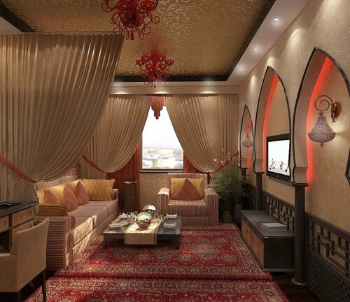 Далее представлены некоторые фотографии зала в восточном стиле, которые могут послужить вдохновением для создания вашего собственного уникального интерьера: