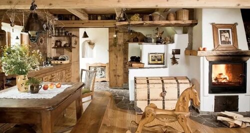Шале – это стиль, который отражает альпийскую атмосферу. В интерьере деревенского дома в стиле шале можно использовать дерево, камень и шерсть. Особенностью этого стиля является использование теплых и насыщенных оттенков, а также многослойности в отделке стен и потолка. Дополните интерьер шале коврами из натурального меха и деревянной мебелью с резьбой.