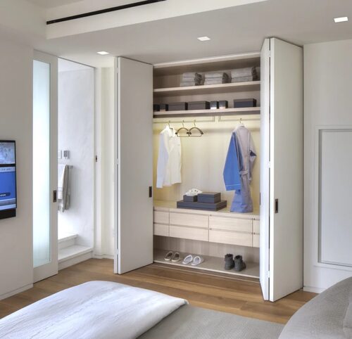 Не забывайте о вертикальном использовании пространства. Высокие полки и вешалки позволят вам использовать верхнюю часть гардеробной, где обычно остается свободное место. Также можно установить штангу для повешенных на плечи платьев и костюмов.