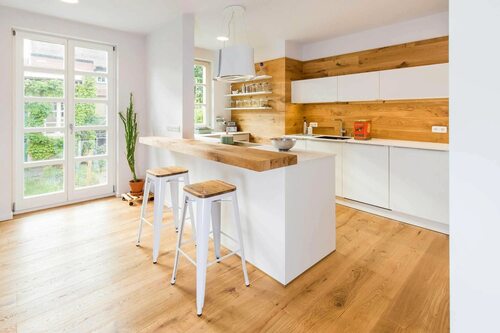 Ниже представлены фото примеры интерьеров кухонь с использованием столешниц под дерево: