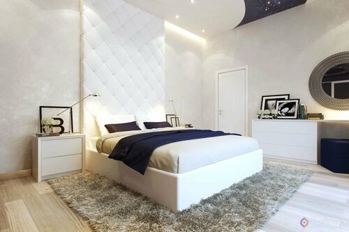 Кровать является главным элементом спальни. Выбирайте модели с простым дизайном и белыми обивками. Дополните ее небольшими ночными столиками в том же стиле. Для хранения вещей можно использовать вместительные шкафы или комоды в белом цвете.