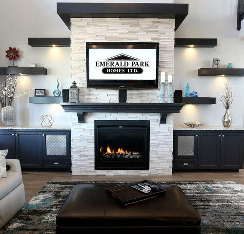 Также не забывайте о правильном освещении. Добавьте некоторые точечные и общие источники света, чтобы создать атмосферу и подчеркнуть красоту стены с камином и телевизором.