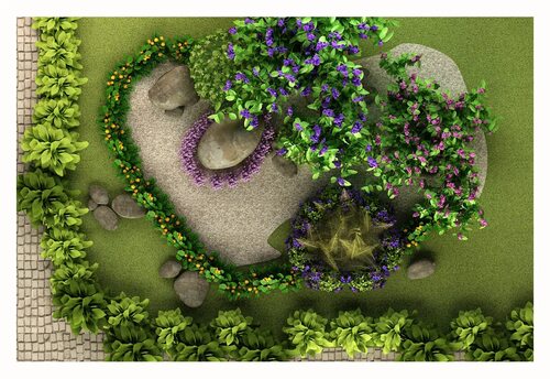 Сочетайте растения с разными формами и текстурами листьев. Это поможет создать интересные композиции и придать цветнику вид сверху дополнительную глубину.