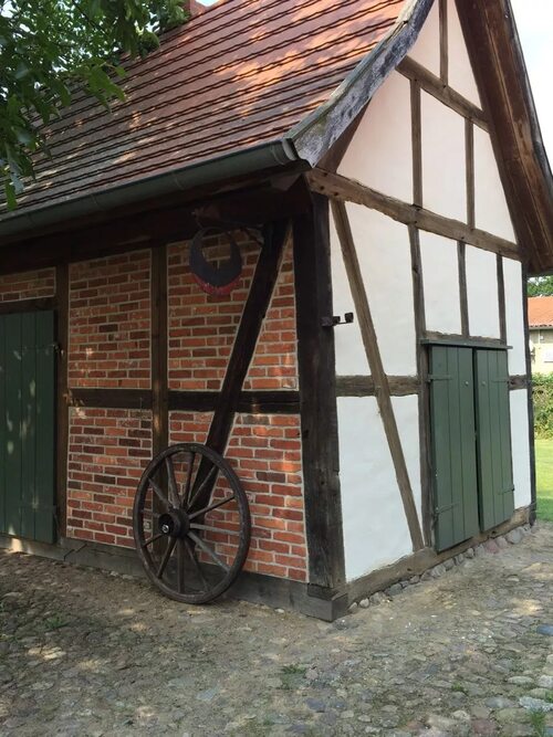 Деревянный каркас и заполнение из глины или кирпича делают хозблок прочным и долговечным. Он может выдерживать различные погодные условия и служить вам на протяжении долгих лет.