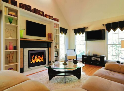 1. Классический стиль в интерьере гостиной с горкой и камином