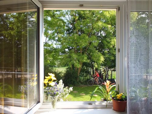 2. Фото 2 - Уютное окно с видом на цветущий сад. Вокруг окна расположены цветочные горшки с яркими цветами, создавая атмосферу летнего сада.