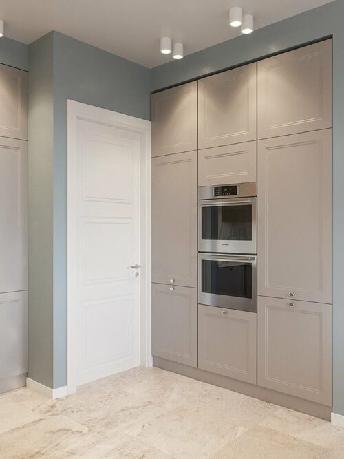 Белые двери на кухне в сочетании с гладкими поверхностями и минималистическими аксессуарами создают современный и стильный интерьер. Простые линии и отсутствие лишних деталей подчеркивают чистоту и элегантность.