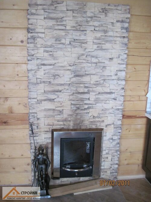 Вот несколько фотографий, которые наглядно демонстрируют процесс облицовки печи в бане декоративным камнем: