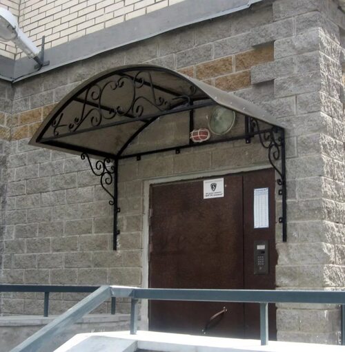 2. Индустриальный металлический навес с коваными элементами, который добавляет характера и уникальности вашему дому.