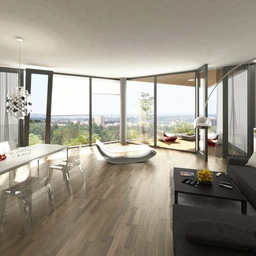 Панорамные окна позволяют впустить максимальное количество естественного света в помещение, что делает его более светлым и просторным. Естественное освещение также положительно влияет на наше настроение и здоровье.