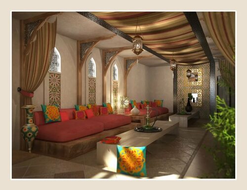 Эта веранда в Восточном стиле украшена ширмой, коврами и диваном с мягкими подушками. Красивое освещение создает таинственную атмосферу.