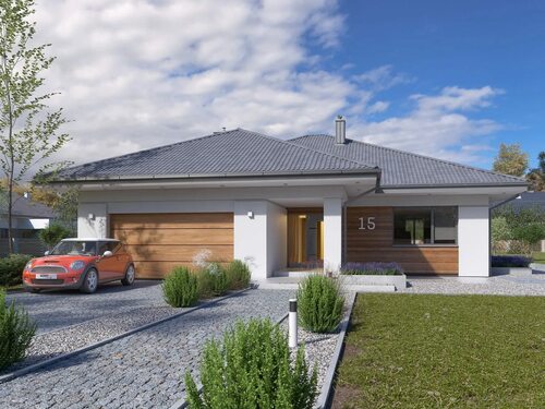 Этот проект представляет собой одноэтажный дом с гаражом, выполненный в экологичном стиле. Весь дом выполнен из натуральных материалов, таких как дерево и камень, создавая гармоничное сочетание с окружающей природой. Гараж дополнительно оснащен зеленым крылом, позволяющим создать оазис спокойствия и комфорта.