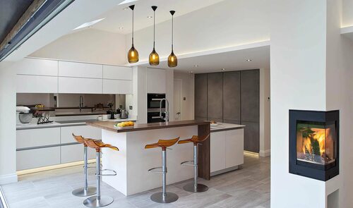 Если у вас большая кухня, вы можете использовать камин как разделитель пространства между зонами. Разместите камин на границе кухни и столовой или гостиной, чтобы создать визуальное разделение и придать каждой зоне свою уникальность. Выберите двусторонний камин, чтобы сделать его видимым с обеих сторон.