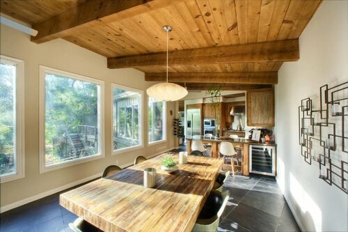 На фото видно, как старый дачный дом был обновлен с использованием ярких цветов и современной мебели. Большие окна позволяют максимально использовать естественное освещение, а открытая планировка делает пространство более просторным и светлым.